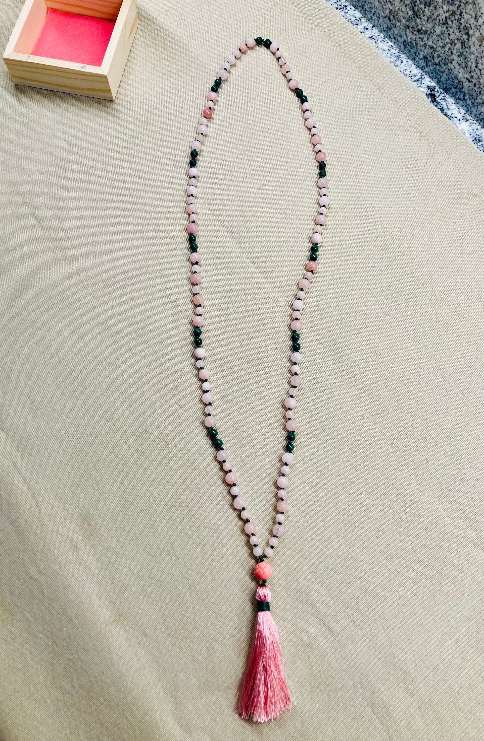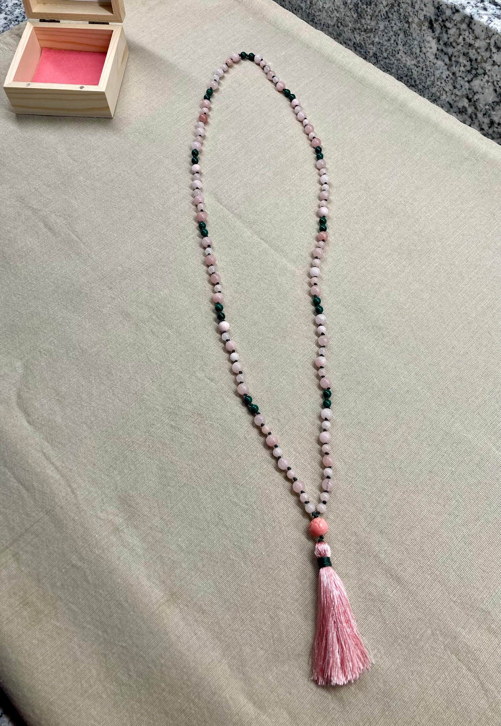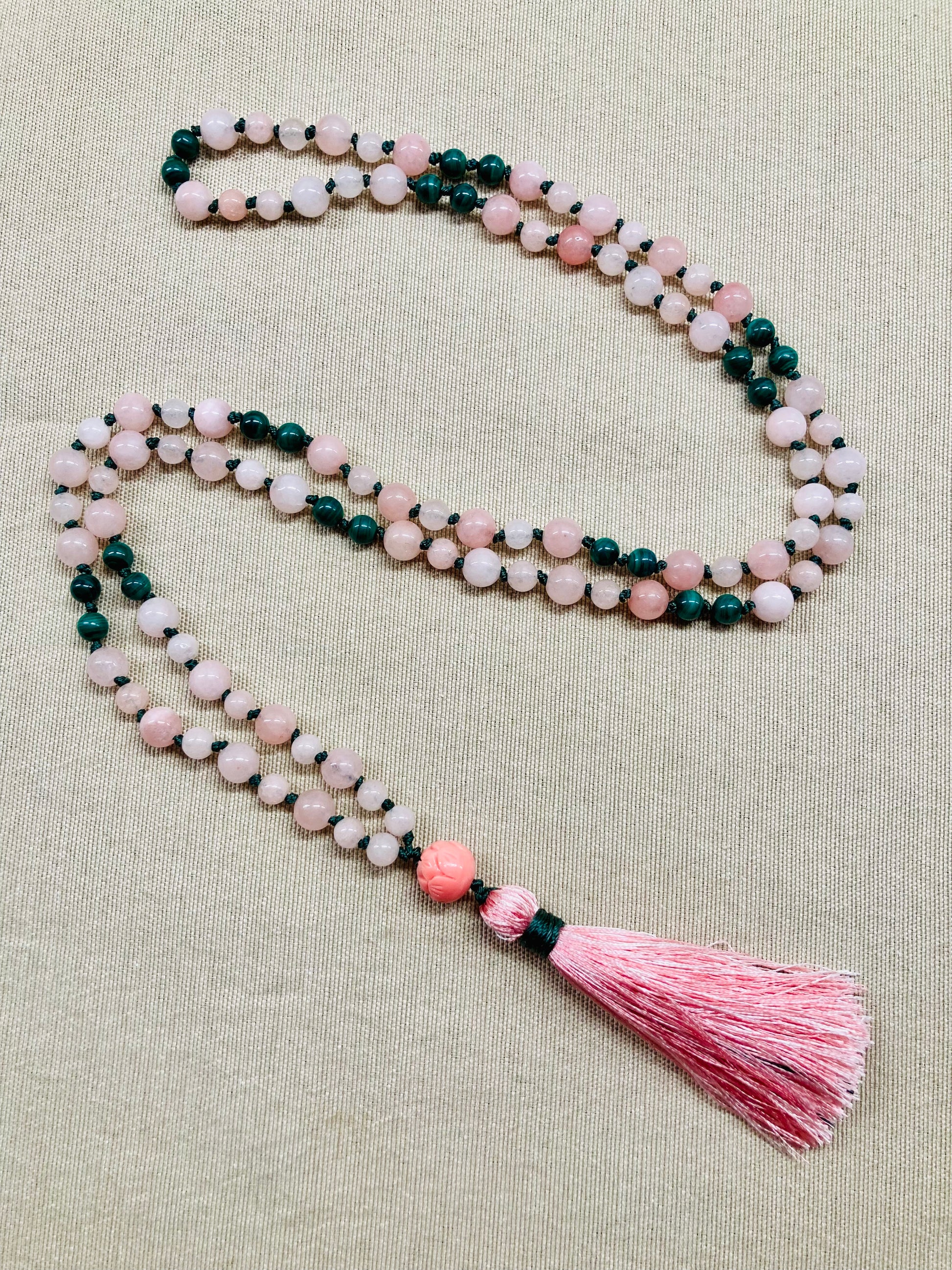 Pink Morganite + Green Malachite Mala
