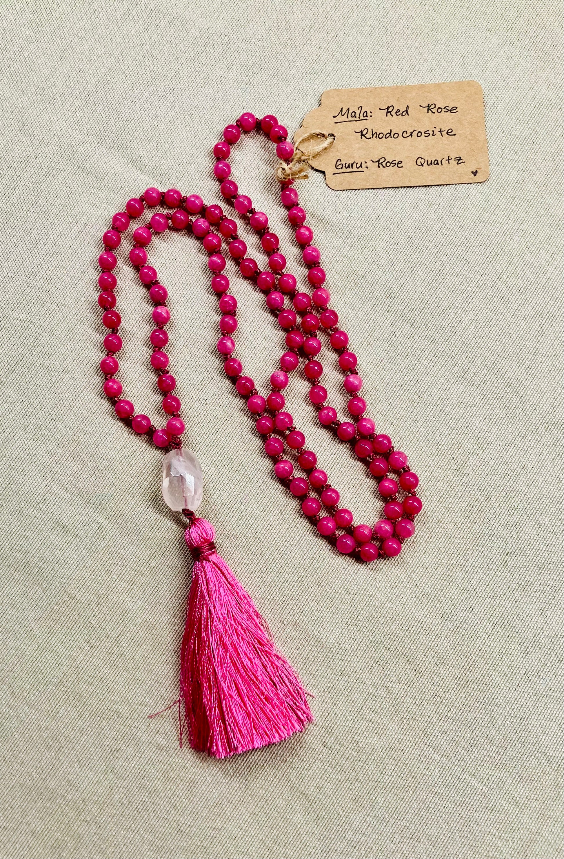 The string is double strung and knotted between each bead to create a secure prayer garland.